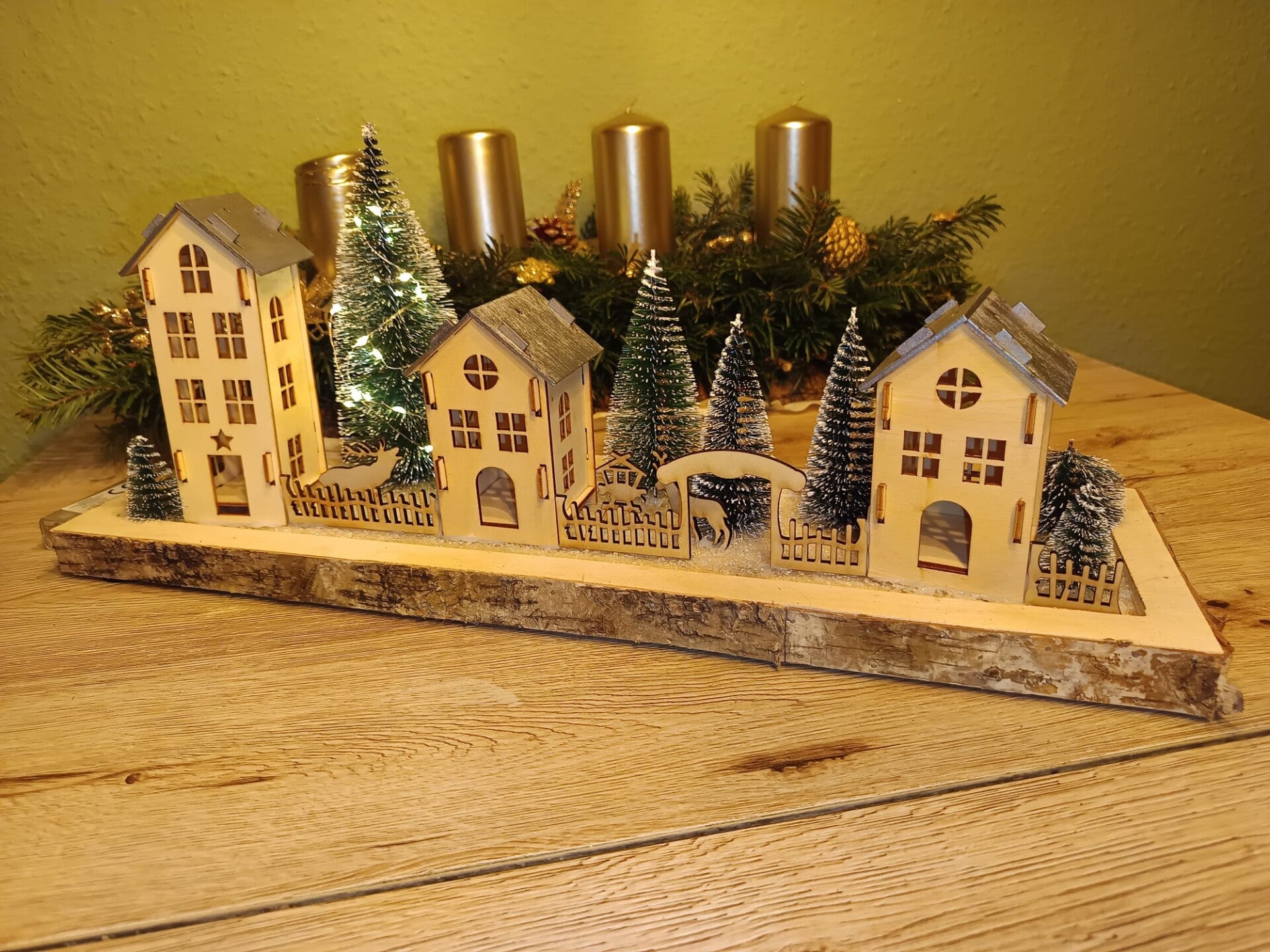 Großes Dorf mit 3 Häusern mit LED beleuchteten Tammenbaum